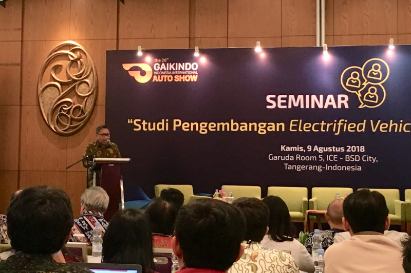 Dirjen Industri Logam Mesin Alat Transportasi dan Elektronika Kementerian Perindustrian Harjanto saat menyampaikan sambutan pada acara Seminar bertajuk 'Studi Pengembangan Electrified Vehicle di Indonesia" di Tangerang, Kamis. (ANTARA News/ Sella Panduarsa Gareta)