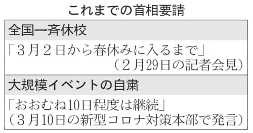 学校の臨時休校を巡っては、3月2日から春休み前まで小中学校や高校、特別支援学校を対象に要請した。文部科学省によると、16日時点で公立小中学校の99%が休校している。首相は20日の対策本部で「新学期を迎える学校の再開に向けて具体的な方針を早急に文科省で取りまとめてほしい」と指示した。