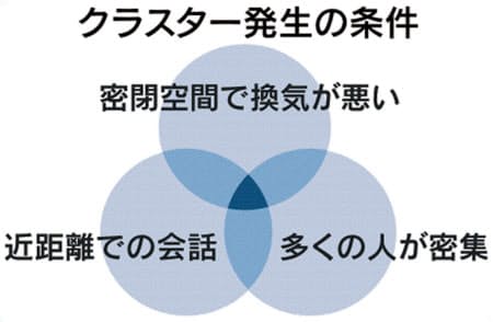 首相はオーバーシュートを防ぐため「クラスター対策の抜本的な強化や、感染者の急増に備え重症者への医療に重点を置く医療提供態勢の整備に全力を挙げて取り組む」と訴えた。(1)換気が悪い(2)多くの人が密集(3)近距離での会話や発声――という3つの条件が同時に重なる場を避けるよう要請した。