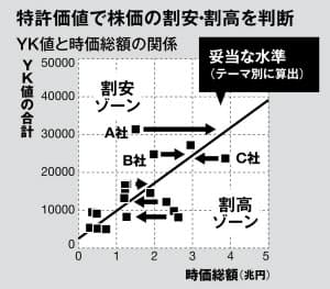 「企業が保有する特許の経済価値の総和と時価総額(株価)には相関がある」という仮説に基づき割安株を探す。特許の経済価値は工藤一郎国際特許事務所が開発したYK値を用いる。YK値は、特許出願に対するライバル社からの成立阻止アクションにかかるコストから算出する。 独自に選んだテーマごとに各社のYK値と時価総額を図のような軸を持つグラフにマッピングすると、妥当と思われる近似曲線が浮かび上がる。この近似曲線から左に大きく離れている企業(図ではA社)は、特許価値、つまり技術力比で時価総額が低い(割安)と考えられる。